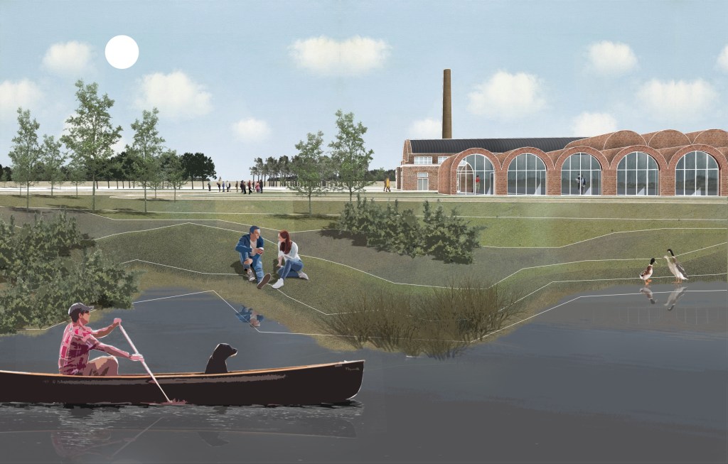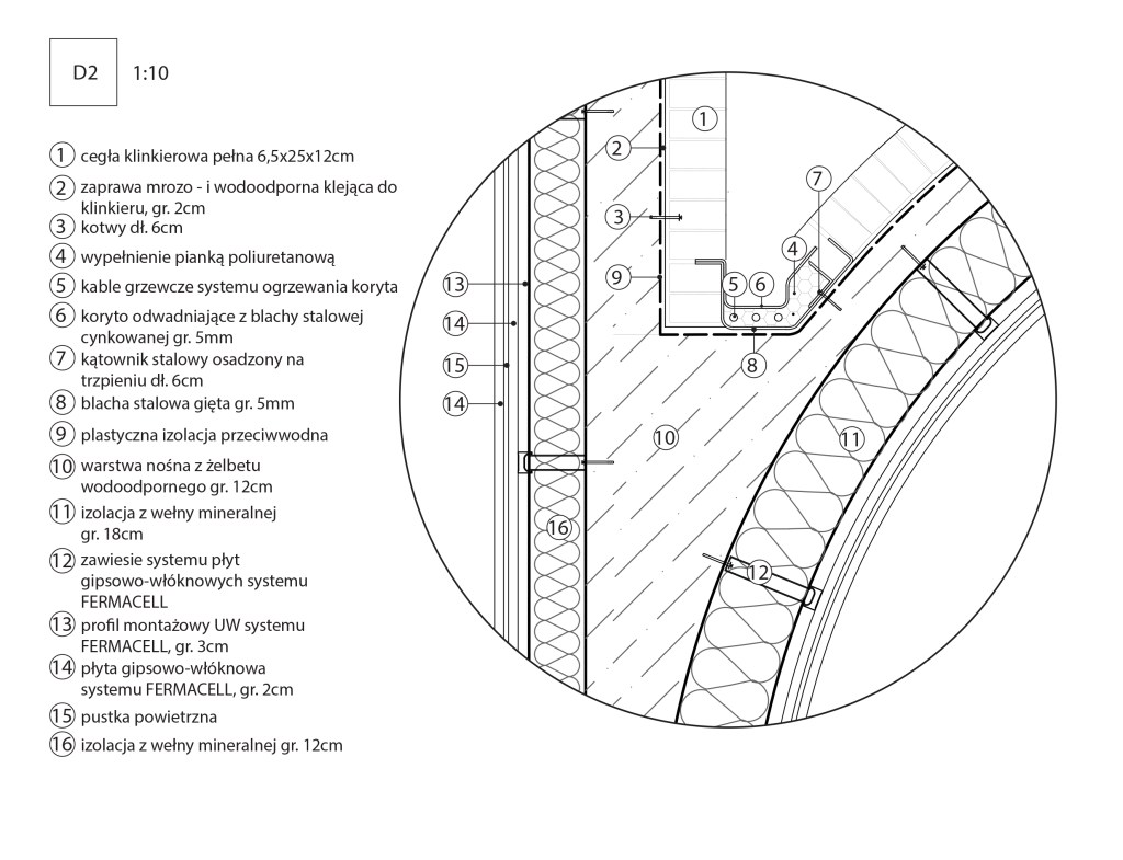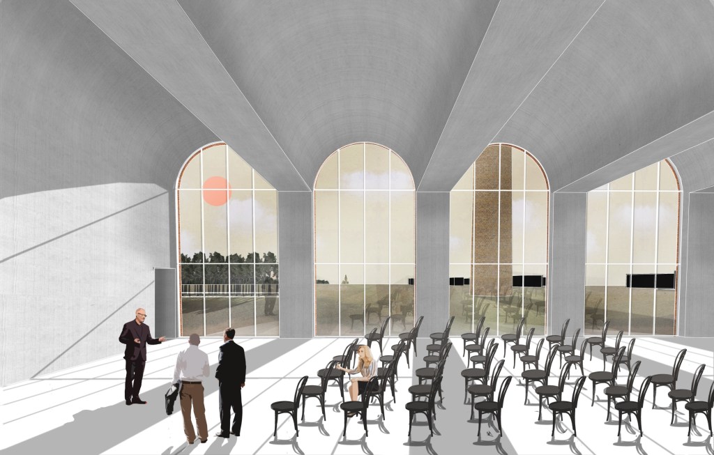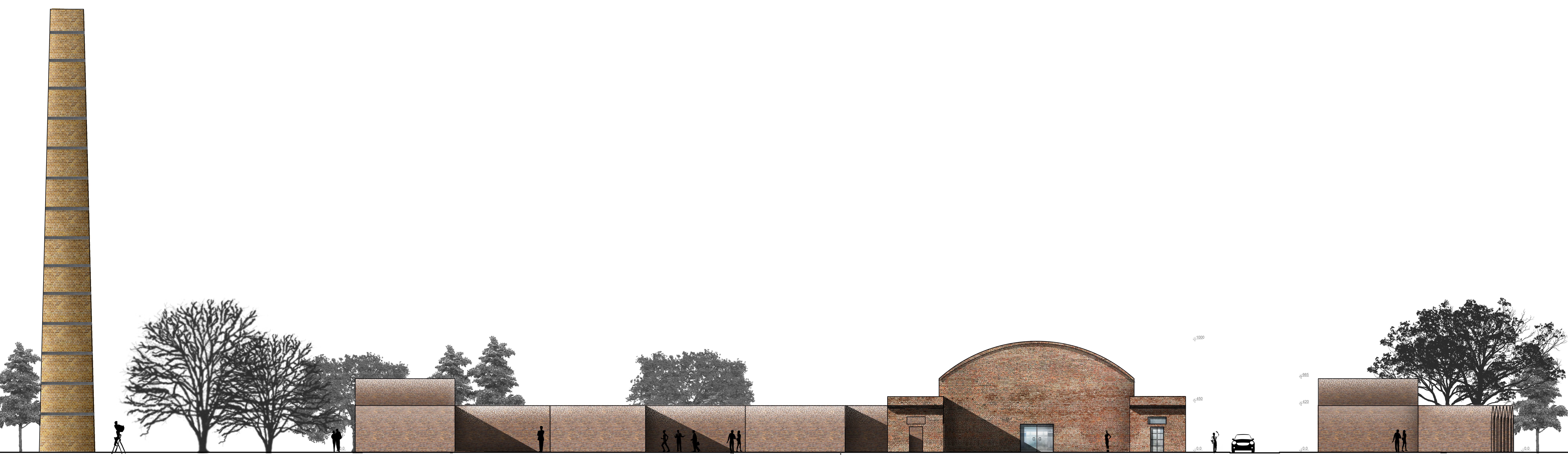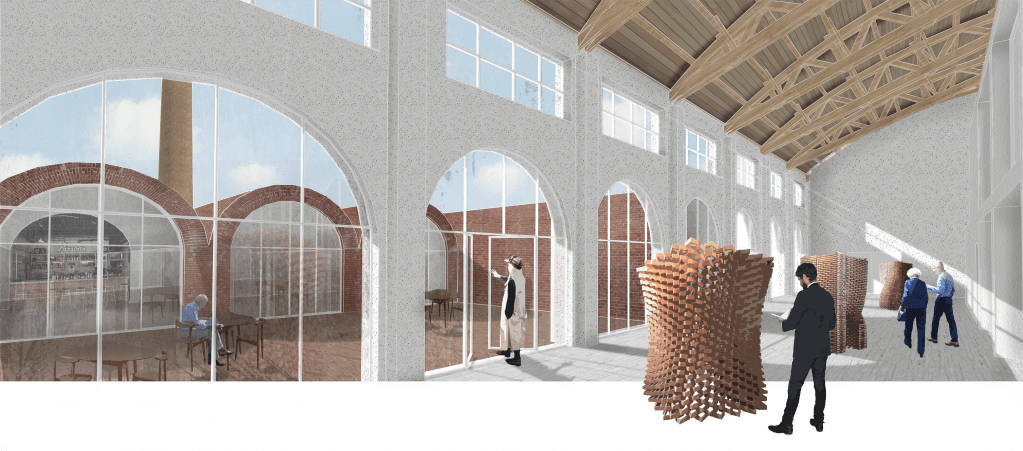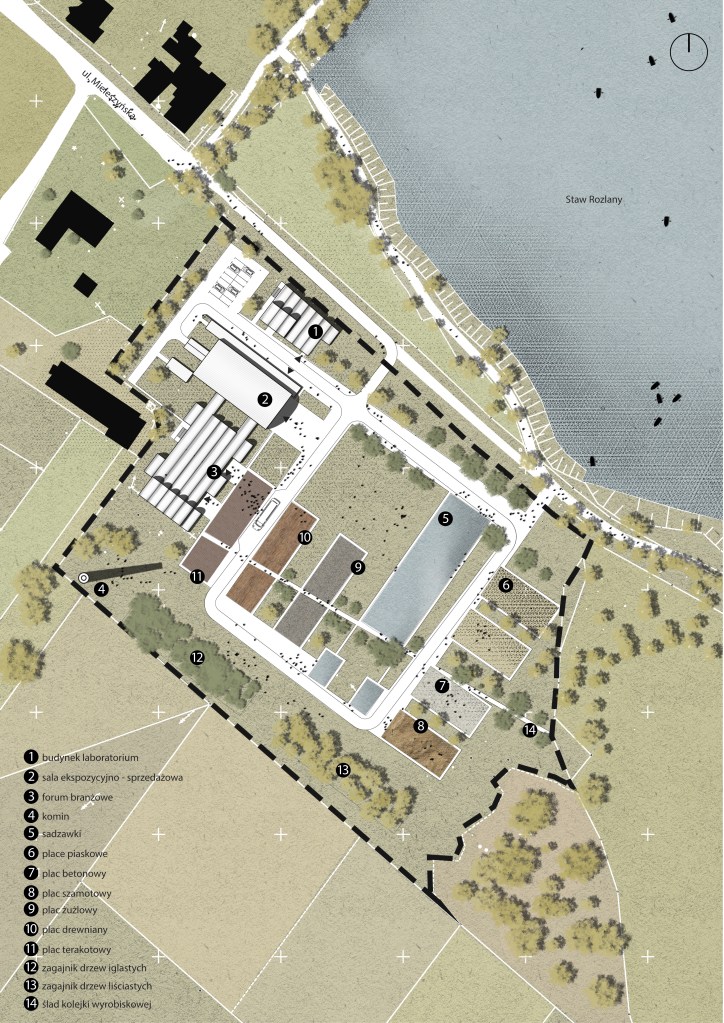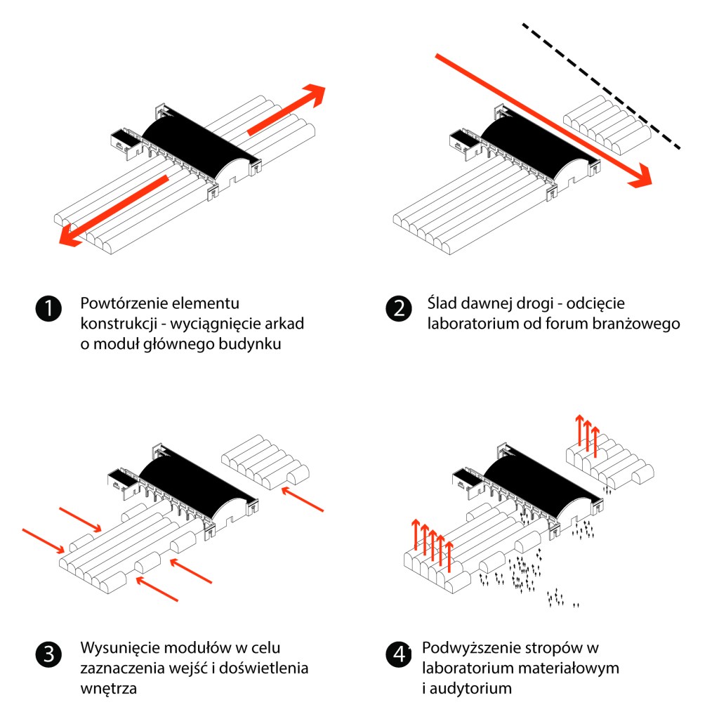 Koncepcja wykorzystuje ruiny jednego z pieców Cegielni Glabisza i uzupełnia je o kubaturę mieszczącą pomieszczenia centrum branżowego i laboratoriów do testowania ceramiki budowlanej.