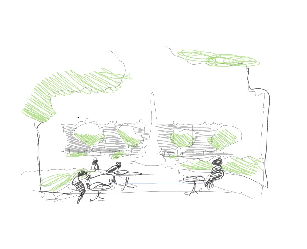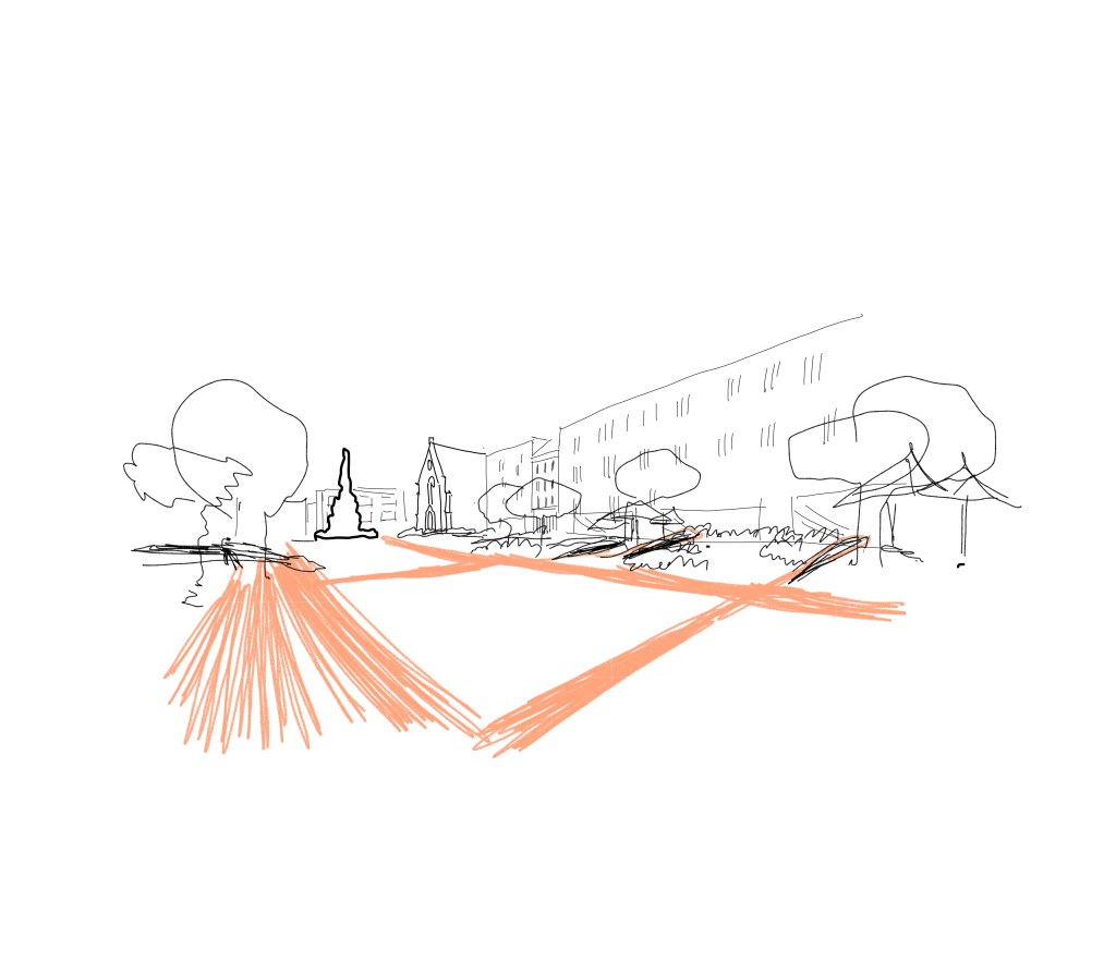 Wzór posadzki, złożony z siatek prostopadłych do kościołów, z centralnym punktem przy kolumnie maryjnej, ma odzwierciedlać historyczne warstwy miasta. Warstwa widokowa ma na celu kształtowanie przestrzeni poprzez odpowiednie kadrowanie zielenią, tworząc sekwencje widoków najważniejszych zabytków.