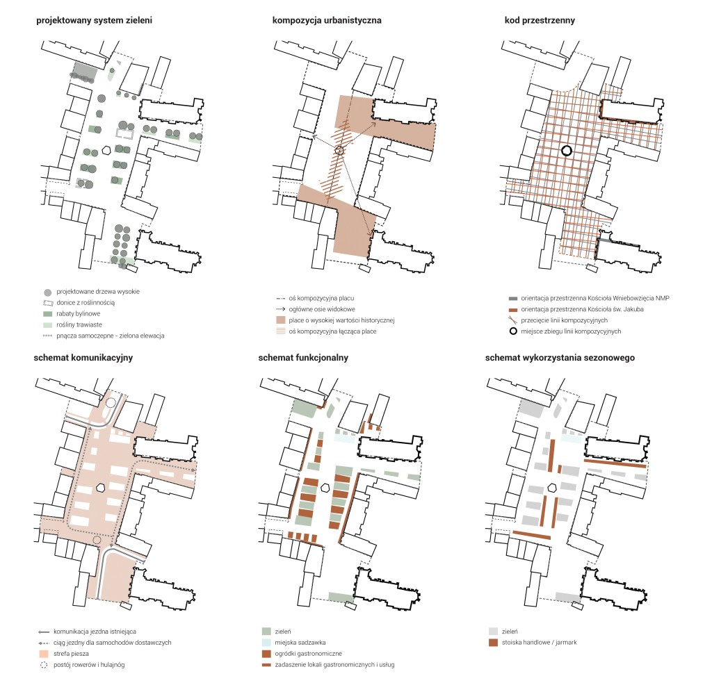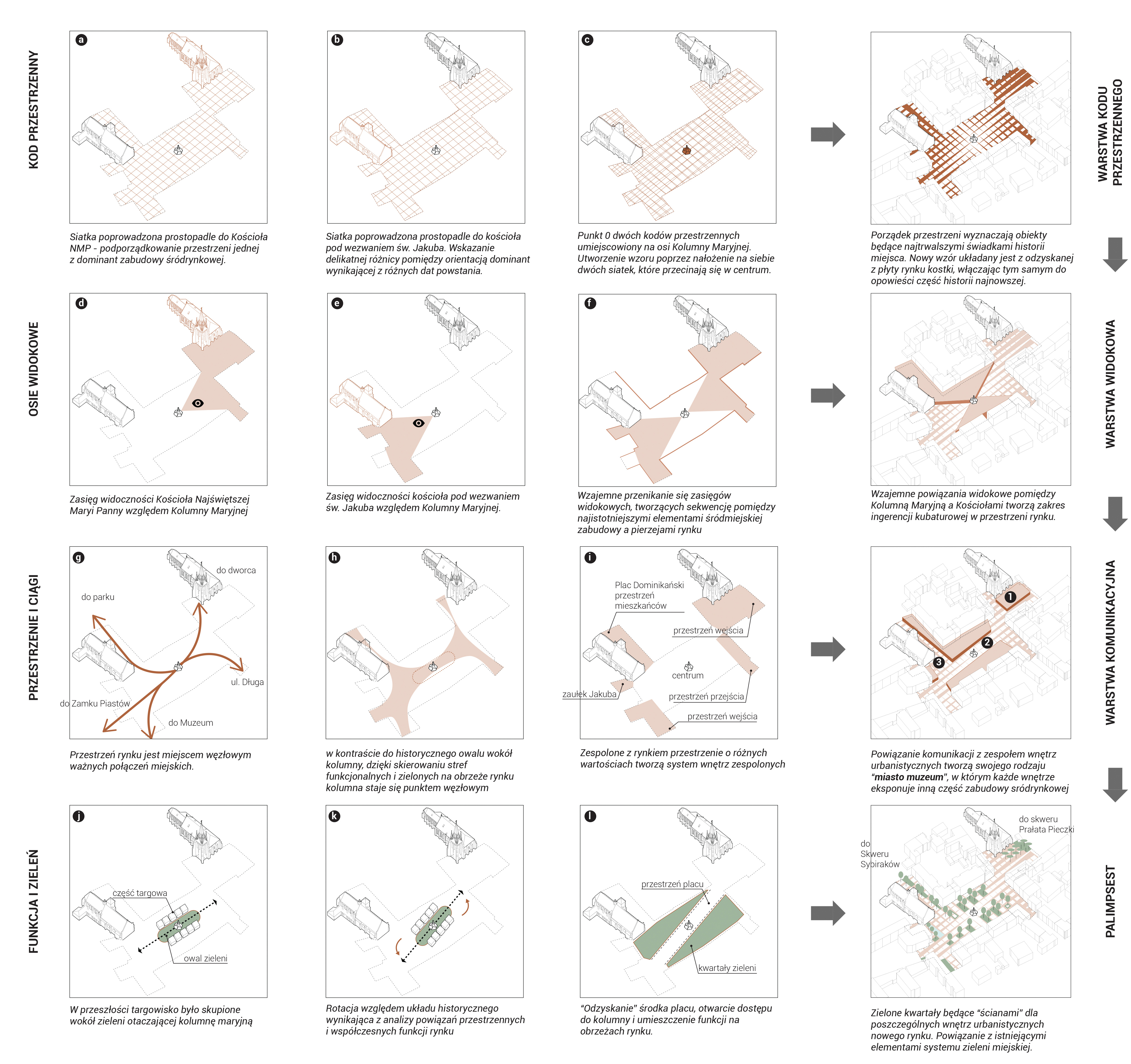 Warstwa komunikacyjna kładzie nacisk na kolumnę maryjną jako główny punkt węzłowy, a warstwa funkcjonalna redefiniuje układ rynku, przesuwając obszary zielone na jego obrzeża, umożliwiając lepszy dostęp do zabytków. Koncepcja miasta-muzeum stara się zintegrować te historyczne warstwy, tworząc przestrzeń, która jest zarówno funkcjonalna, jak i bogata w konteksty historyczne.