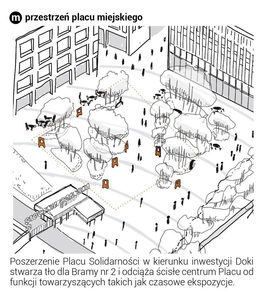 Projektowane uzupełnienia zabudowy stoją w opozycji do obecnie realizowanych inwestycji w sąsiedztwie placu, których przeskalowane gabaryty deformują tkankę miejską i prowadzą do sytuacji, w której pojedyncze budynki dominują w tle i zmniejszają rangę Pomnika. Projektowana zabudowa mieszkaniowa nawiązuje do pierzejowej zabudowy niegdyś dominującej obszarze obok stoczni. Projekt zakłada rozdrobnienie zabudowy i uzupełnienie quasi-kwartałów zabudową mieszkaniową z przyziemiem usługowym. Podobnie jak wydzielone z przestrzeni placu wspólnoty mieszkaniowe, nowa zabudowa posiada swoje podwórka i przestrzeń, która może stanowić rozszerzenie dla funkcji zlokalizowanych w parterze.