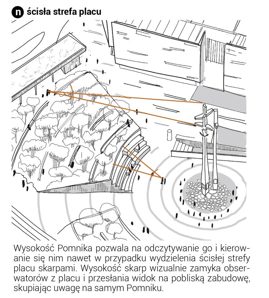 Okręgi w płycie placu to „symbol solidarnościowych idei rozchodzących się na cały świat”. Przebijają się przez mury oporowe, poza posadzkę placu co podkreśla ich symbolikę dalszego rozchodzenia się idei. Zieleń w sposób funkcjonalno-kompozycyjny tworzy ścianę wnętrza urbanistycznego Placu Solidarności Domknięcie placu buduje atmosferę powagi przynależną Założeniu Pomnikowemu. Strukturę otoczenia strefy Placu Solidarności definiuje sieć proponowanych placów i kwartałów.