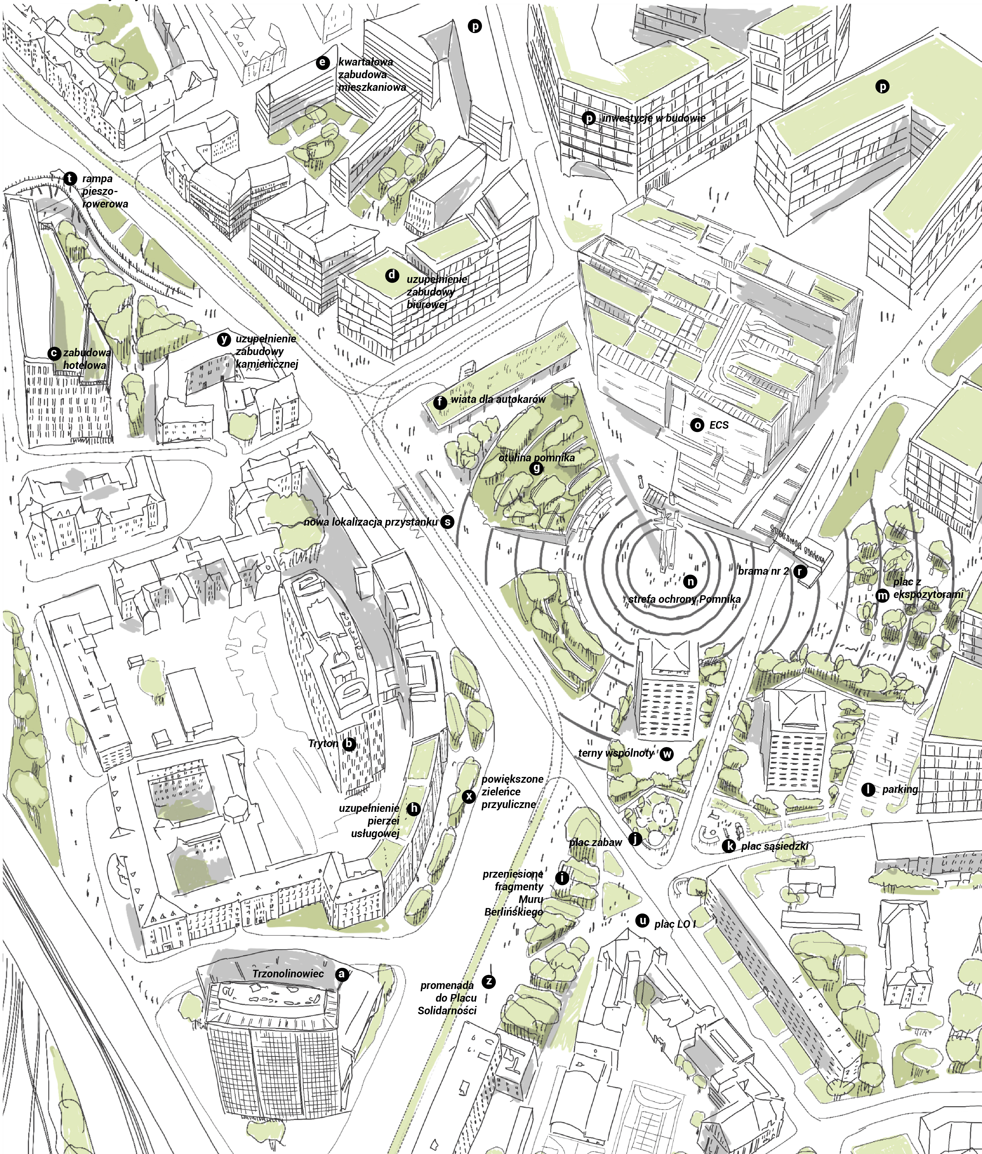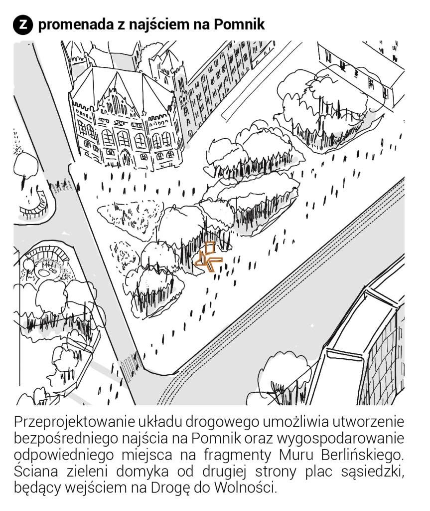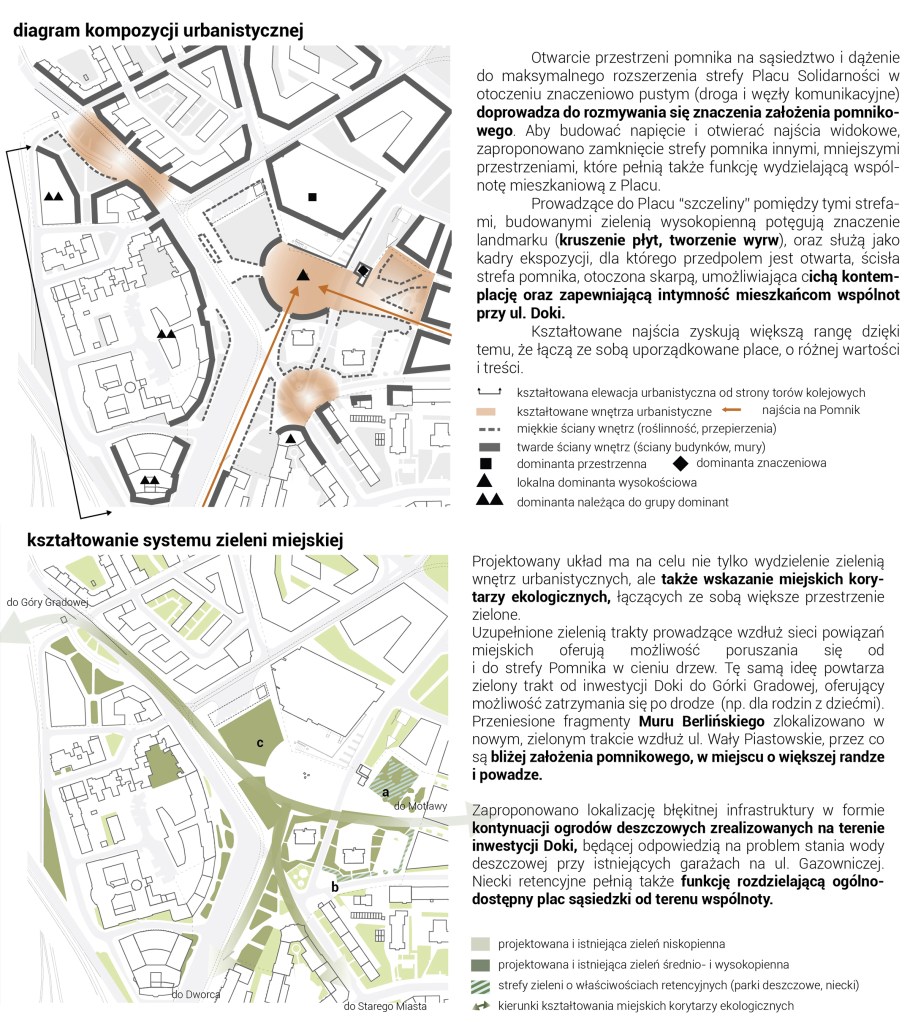 Zróżnicowana funkcja zabudowy oferuje możliwość tworzenia placów o różnej randze i znaczeniu – reprezentacyjnym, kulturowym i sąsiedzkim. Kompozycja Placu Solidarności podkreśla jego dominującą funkcję założenia pomnikowego, wizualnie wydzielając jego przestrzeń murami oporowymi i zielenią wysoką.