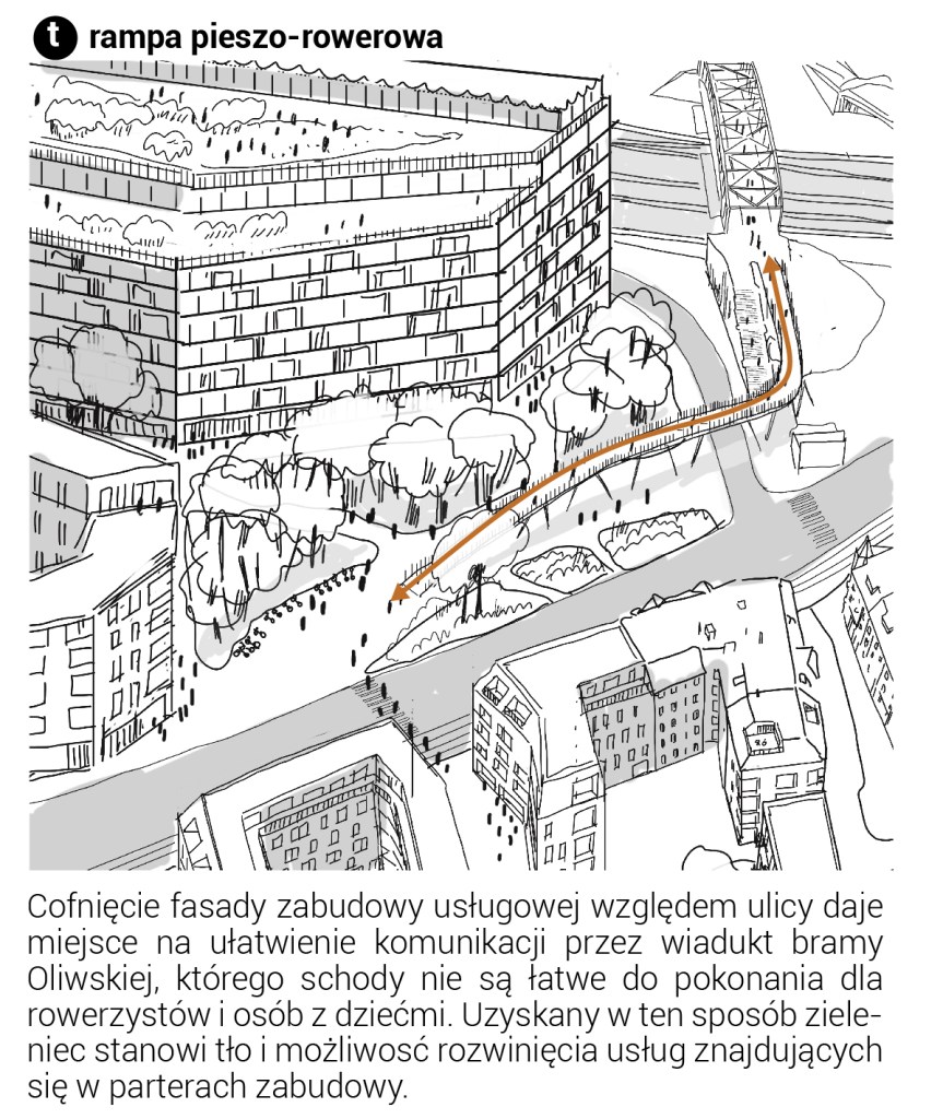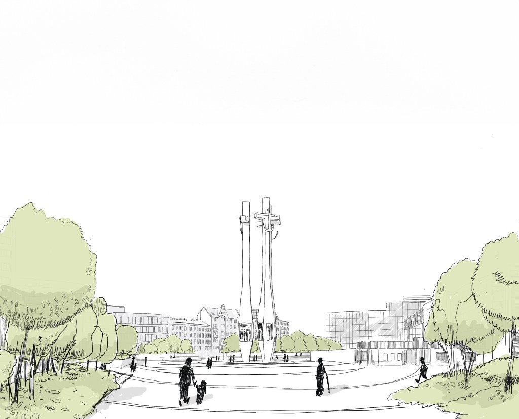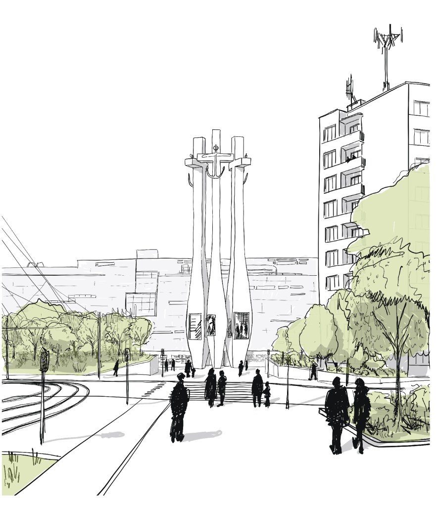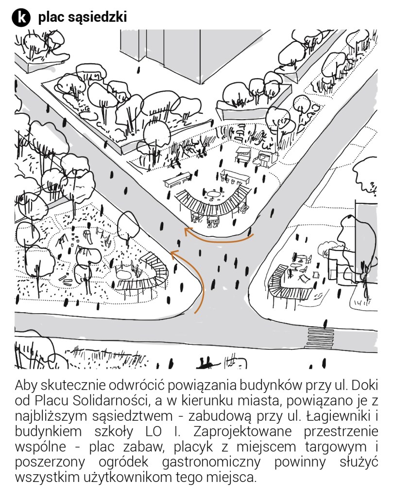 Zróżnicowana funkcja zabudowy oferuje możliwość tworzenia placów o różnej randze i znaczeniu – reprezentacyjnym, kulturowym i sąsiedzkim. Kompozycja Placu Solidarności podkreśla jego dominującą funkcję założenia pomnikowego, wizualnie wydzielając jego przestrzeń murami oporowymi i zielenią wysoką.